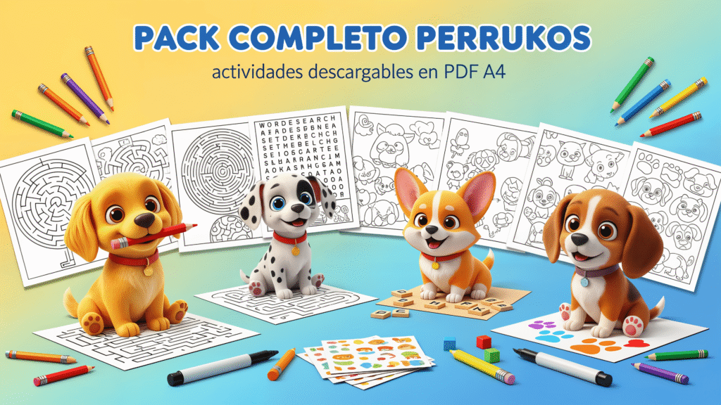 Todo en un solo pack, listo para descargar y disfrutar al instante. Este Pack Completo Perrukos es perfecto para padres que buscan actividades infantiles imprimibles, libros para colorear PDF para niños, láminas para colorear y recursos creativos que puedan usar una y otra vez. ¡Imprime en A4 y deja que la imaginación de tus hijos vuele!