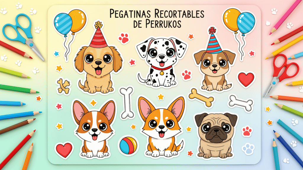 Las Pegatinas Recortables de Perrukos son un archivo PDF digital, cuidadosamente diseñado para ofrecer a los niños horas de diversión creativa. Este material pertenece a nuestras actividades infantiles imprimibles, y está pensado para que los pequeños puedan descargar, imprimir y recortar un conjunto exclusivo de pegatinas inspiradas en los adorables personajes de Perrukos.